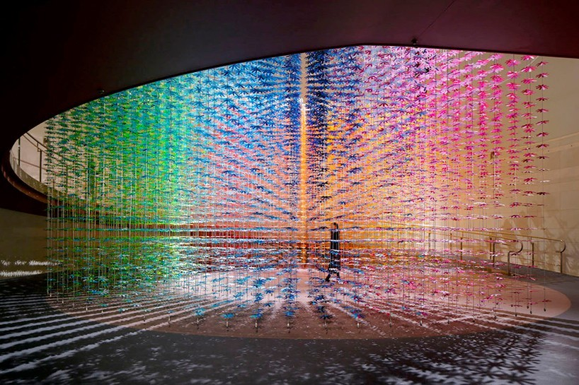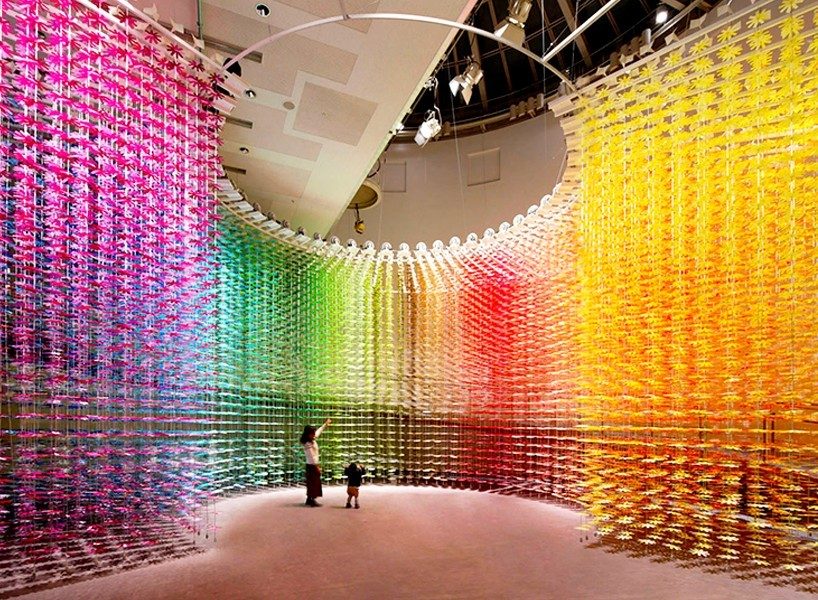 (图O-2)日本精工株式会社是日本著名的发动机和汽车零部件制造商之一。“在运动中设定未来(setting the futire in motion )”是庆祝日本精工株式会社成立100周年的展厅设计的主题。整个室间由100种颜色组成的25200朵花整齐排列成3D网格状